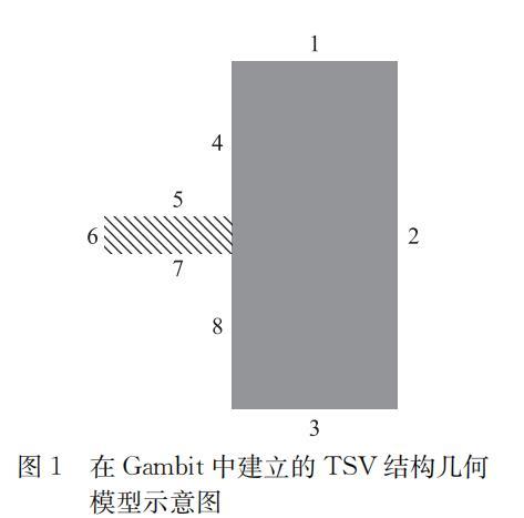 按照實(shí)際電鍍液及樣片的情況,在流體仿真軟件中進(jìn)行建模。主要分為2個(gè)部分:前處理軟件Gambit中對(duì)平面模型的建立,F(xiàn)luent中對(duì)流場(chǎng)進(jìn)行具體解算。本文截取TSV軸對(duì)稱結(jié)構(gòu)的中心軸截面,建立二維分析模型,直接反應(yīng)實(shí)際TSV的浸潤(rùn)過(guò)程。同時(shí),基于對(duì)比實(shí)驗(yàn)考慮,忽略電鍍液組分與被浸潤(rùn)表面化學(xué)反應(yīng)造成的界面影響,并直接采用與電鍍液物理性質(zhì)基本相同的水作為液相組分。氣相組分中采用理想不可壓氣體假設(shè)模擬正常大氣壓下的操作環(huán)境。建立的Fluent分析模型如圖1所示。其中較小的矩形塊代表TSV,4~8代表被潤(rùn)濕表面。初始情況下,所有被模擬區(qū)域?yàn)闅庀鄥^(qū)域,之后液相從邊界3以特定流速進(jìn)入(除流速討論單元,其余均設(shè)置為0.05 m/s),逐步潤(rùn)濕全部或局部表面,直至從邊界1流出。具體設(shè)置為邊界1為壓力出口,2為對(duì)稱邊界,3為速度人口,4、5、6、7、8均為壁面邊界條件。表面張力和接觸角均采用實(shí)際測(cè)量值0.06 N/m,64°;重力加速度為9.81 m/s2,方向?yàn)樨Q直向下。