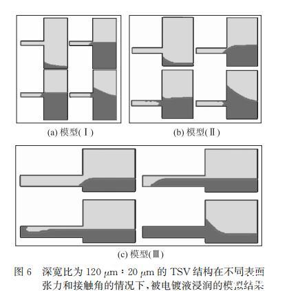 模型(I)使用的表面張力和接觸角為不含活性劑的TSV標(biāo)準(zhǔn)鍍液的實際測量值,仿真結(jié)果是不能完全浸潤;模型(II)采用的是在1L TSV標(biāo)準(zhǔn)鍍液中加入20mL活性劑溶液的實際測量值,這兩種模型在仿真中均表現(xiàn)為不能完全浸潤。