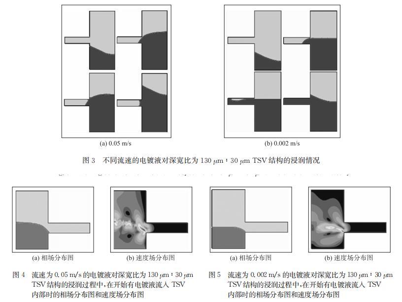 TSV深寬比設(shè)置為130μm:30μm,電鍍液流人速度為0.05 m/s和0.002 m/s的浸潤仿真結(jié)果分別如圖3所示,前者在TSV底部形成氣泡,后者可以完全浸潤。模擬結(jié)果表明降低電鍍液流入速度有利于浸潤。通過仿真中兩種情況下浸潤過程中的流速場對比,可以看出在電鍍液流入的過程中,電鍍液流人速度較大時,如圖4(b)所示,電鍍液表面距離TSV較遠的部分有著相對更大的流速,即電鍍液流過TSV上方的速度大于電鍍液向TSV內(nèi)部流入的速度,導(dǎo)致在電鍍液流過TSV上方時,其流入TSV內(nèi)部的分流量還沒有充滿TSV內(nèi)部排出其中氣體之前,電鍍液就已經(jīng)流過了TSV上方,并將TSV口部封死,導(dǎo)致內(nèi)部殘留氣體無法排出,形成不完全浸潤;而當(dāng)電鍍液流入速度較小時,如圖5(b)所示,電鍍液表面在TSV口部附近具有相對更大的流速,即電鍍液向TSV內(nèi)部流入的速度大于其流過TSV上方的速度,使得電鍍液流過TSV上方時,有足夠的分流量流入TSV內(nèi)部,將其中氣體排出并將TSV填滿,實現(xiàn)完全的浸潤。