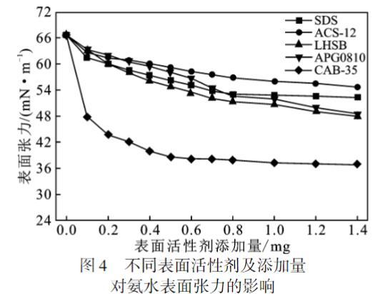 氨水中表面活性劑含量在0~0.2mg范圍內(nèi),含SDS的氨水表面張力降幅僅比含CAB-35的氨水表面張力降幅小。0.1mg時(shí),LHSB和APG0810降低氨水表面張力的幅度相同(5.10%),繼續(xù)升高表面活性劑添加量,相同濃度下含LHSB的氨水表面張力降幅均比含APG0810的氨水表面張力降幅大。當(dāng)含量大于0.8mg時(shí),氨水溶液表面張力值降低幅度的大小關(guān)系為CAB-35 > LHSB > APG0810 > SDS > ACS-12。