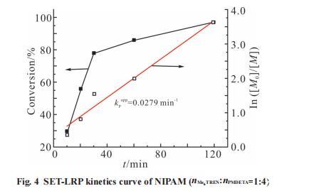 從Fig.4可以看出,當混合配體n(Me6TREN):n(PMDETA)=4:1時,轉化率隨反應時間延長而增大,反應時間為2h時,轉化率達到95%。