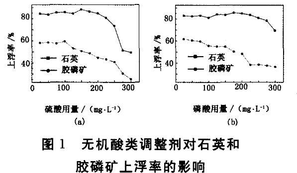 硫酸和磷酸是較為有效的膠磷礦抑制劑,工業(yè)應用廣泛。考察傳統(tǒng)調(diào)整劑對石英和膠磷礦可浮性的影響,結果見圖1。