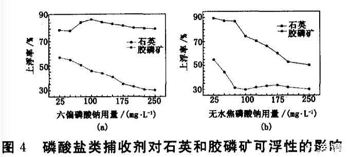 除了上述調(diào)整劑,含有磷酸根的六偏磷酸鈉及無水焦磷酸鈉也可抑制膠磷礦,這類磷酸鹽除了可以在酸性條件下抑制膠磷礦外,還能在礦漿中起到一定的分散作用。試驗結果見圖4。