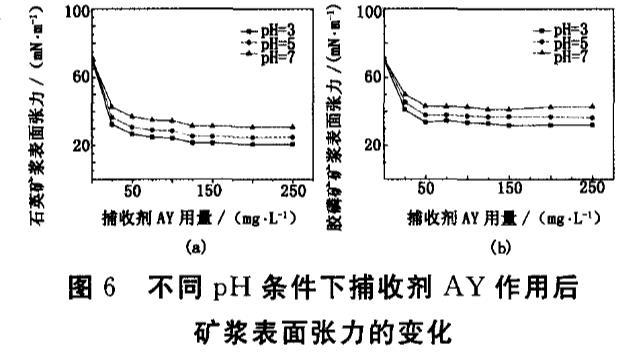 本研究對多種調整劑作用下石英和膠磷礦的可浮性進行了考察,并通過表面張力分析說明礦漿表面張力的影響及捕收劑AY在礦漿中的活性,但還需要在以后的研究工作中進一步探討捕收劑在石英和膠磷礦表面的吸附機理。