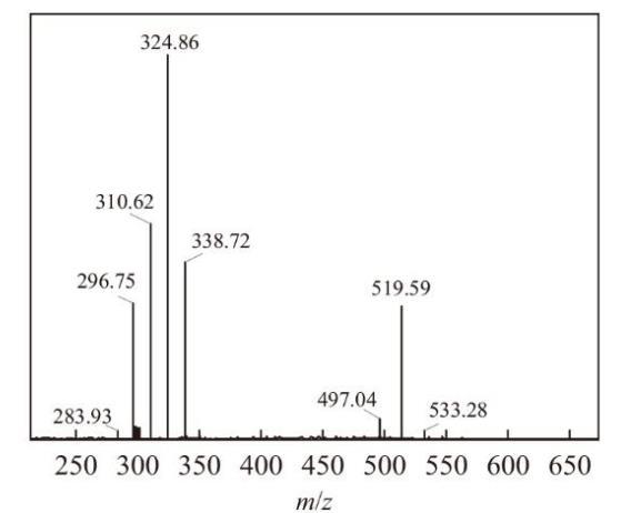以DL-5為例,MADS的分子量M1=542,LAS為碳鏈C10~13的混合物,M分別是318,332,346,360。由圖1質譜圖可以看出,離子峰m/z=519.59為失去一個鈉離子的MADS;離子峰m/z=296.75,310.62,324.86,338.72分別為失去一個鈉離子的C10~13烷基苯磺酸鹽,證明確為烷基二苯醚/烷基苯混合磺酸鹽。