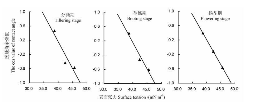 通過Delta-8表面張力儀直接測定,分蘗蘗期、孕穗期、揚花期水稻葉片的臨界表面張力值分別為34.46、34.36和34.33 mN/m。結(jié)果如圖2所示,清晰展示了不同生育期的差異。