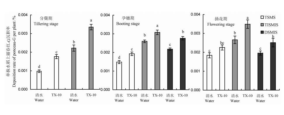 從圖4可以看出,在水稻分蘗蘗期、孕穗期和揚花期用不同噴霧方法噴灑清水和TX-10溶液配制的麗春紅-G溶液,麗春紅-G的沉積率都表現(xiàn)為彌霧機下傾噴霧方法>彌霧機漂移噴霧方式>手動噴霧器壓頂噴霧方法。以在水稻生長量較小的分蘗蘗期增加幅度最大,彌霧機下傾噴霧方法噴灑清水和TX-10溶液配制的麗春紅-G溶液,麗春紅-G在水稻植株上的沉積率分別比手動噴霧器壓頂噴霧增加了127.59%和89.82%,差異達顯著水平(F=57.17>F0.01=26.18,df=3,116,P<0.01)。