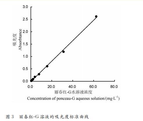 圖3是以麗春紅-G溶液的質(zhì)量濃度為橫坐標,以不同濃度麗春紅-G溶液在510nm處吸光度為縱坐標的標準曲線,其方程為y=0.0413x-0.0142(R2=0.9980)。