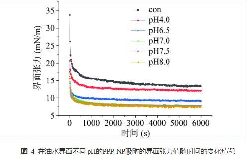 由于從乳液界面去除吸附顆粒需要巨大的解吸能量,因此顆粒的界面吸附被認為是一個不可逆的過程。PPP-NP在油-水界面的吸附可能包括至少兩個階段:第一階段PPP-NP接近乳液界面并滲透到油-水界面,第二階段顆粒附著在界面,導致粘彈性界面膜的形成。由于乳化劑的界面特性是評估其穩定乳液能力的關鍵因素,因此測定了不同pH條件下PPP-NP的界面張力的變化。