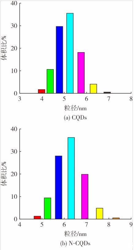 圖3是CQDs和N-CQDs的粒徑分布直方圖。由圖3可知,兩種碳量子點的粒徑分布都比較均勻,CQDs粒徑集中分布在(5.25±0.5)nm,N-CQDs粒徑集中分布在(6.31±0.5)nm,且都在10 nm以下,符合碳量子點的粒徑特征。此外,N-CQDs的粒徑整體略大于CQDs,可能是由于氮原子的摻雜打破了碳量子點的完整晶格結構,導致碳量子點發生晶格畸變和扭曲,進而影響形成的碳量子點的粒徑。