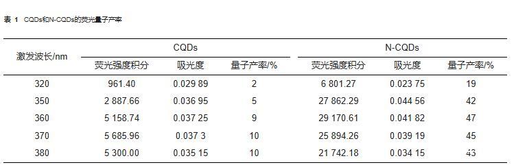對圖5中不同激發波長下CQDs和N-CQDs的熒光發射光譜計算熒光積分強度后計算不同激發波長下的熒光量子產率(硫酸奎寧在313 nm激發波長下的熒光強度積分為22 860.61,吸光度為0.028 63),結果見表1。