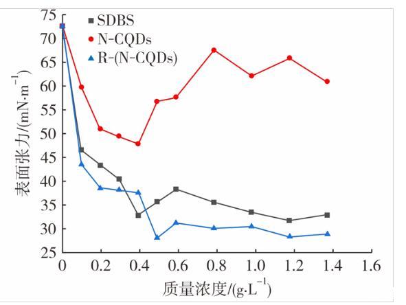 圖6 SDBS、N-CQDs及R-(N-CQDs)表面張力與質量濃度的關系