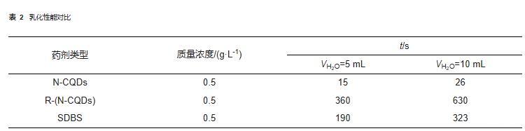 從表2可看出,R-(N-CQDs)的乳化性能遠優于SDBS,分離出5 mL和10 mL水的時間接近SDBS的兩倍。這是由于R-(N-CQDs)是納米顆粒,吸附在界面膜附近可以大大增強界面膜的強度,從而增強了乳狀液的穩定性。