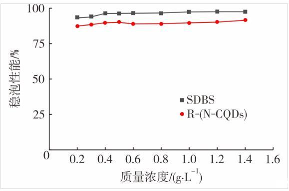 圖8是穩泡性能測試結果。從圖8可看出,R-(N-CQDs)的穩泡性能一直保持在95%以上,SDBS的穩泡性能一直處于90%與95%之間。這是因為R-(N-CQDs)本身結構的原因,碳量子點表面存在羥基、叔胺等親水基團,同時,還存在很多疏水長碳鏈,這使得R-(N-CQDs)能夠很好地吸附在氣液兩相界面(即液膜表面)上,在液膜表面形成納米粒子保護層,一方面,增加了液膜強度;另一方面,減少了泡沫的歧化現象,大大增加了泡沫的穩定性。