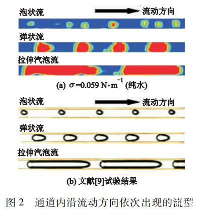 通道內沿流動方向依次出現的流型如圖2所示,圖2a為σ=0.059 N·m?1(純水)條件下,數值計算得到的微通道內汽液兩相呈現的流型。不難看出:沿流動方向依次出現泡狀流(汽泡呈球形)、彈狀流(汽泡呈前端橢球,中間圓柱體,尾端近扁平狀)和拉伸汽泡流(汽泡在微通道內受限,呈拉伸的柱形)3種流型。這與通過沸騰試驗得到的490μm矩形通道內觀測段的流型及汽泡形態(圖2b)一致。此外,數值模擬結果還與其他文獻中的試驗結果進行比對,結果表明:計算模型與數值方法可行,計算結果與試驗數據吻合較好。