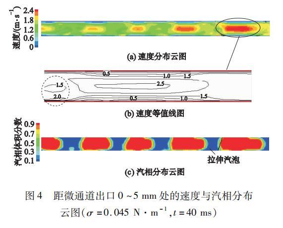 圖4距微通道出口0~5mm處的速度與汽相分布云圖(σ=0.045 N·m?1,t=40 ms)