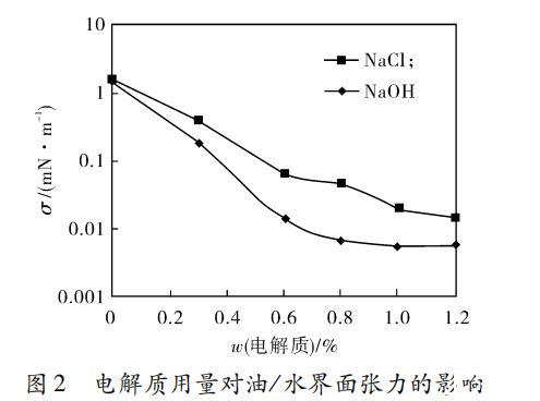 NaOH加入到HABS體系中相當于加入了電解質,因此,體系中的NaOH除了發揮堿的作用以外還具有普通電解質的作用。為了考察NaOH的電解質作用,采用與NaOH質量分數相同的NaCl作對比,考察NaCl對正壬烷/水界面張力的影響,實驗結果見圖2。