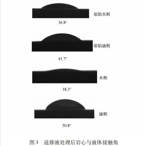 巖心原始水相、油相潤濕角均小于90°,巖石表面親水性更強。經過返排液浸泡后巖石表面水相潤濕角變小,油相潤濕角變大。返排液浸泡后巖石表面水潤濕性更好,因為返排液中含助排劑中的表面活性劑成分,表面活性劑吸附于巖石表面,使巖石表面水潤濕性增強,并影響油、水相對滲透率,能有效的提高采收率。