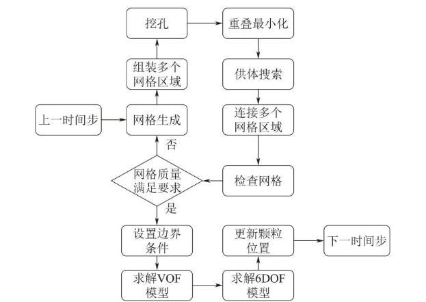 本文使用的重疊網格方法廣泛應用于模擬移動網格的邊界運動問題。重疊網格技術的工作原理包括挖孔、重疊最小化和供體搜索。首先,生成互不約束的背景網格和重疊網格,滿足N-S求解器的三階離散化。在求解的迭代過程中,流場數據通過內嵌邊界進行傳輸。其次,確定執行各自職責的單元,包括挖孔單元、重疊邊界單元(接收單元)和計算單元(供體單元)。挖孔單元是指通過挖掘操作丟棄的一些煩瑣單元。重疊邊界單元主要圍繞挖孔單元,并被視為每個重疊網格中的邊界。重疊邊界單元與計算單元之間的關系通過插值確定。具體實現流程如圖1所示。