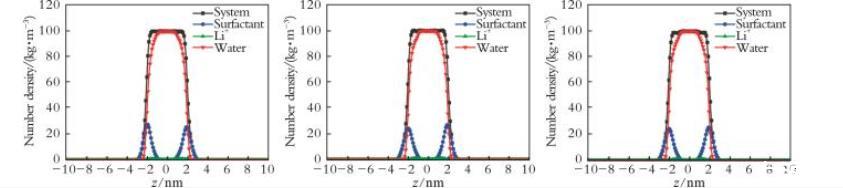 圖4為不同復配體系下z軸方向的數密度分布。由圖4可知,沿z軸的數密度分布可清晰界定氣相、界面區與液相的位置及界面厚度。通過該分析能直觀地揭示氟碳鏈、氫碳鏈、水分子及各復配組分在界面區域的富集程度、分布輪廓及其與純體系的差異,不同原子/基團(如極性頭基與疏水尾鏈)在z軸上的位置偏移間接反映分子的取向偏好。