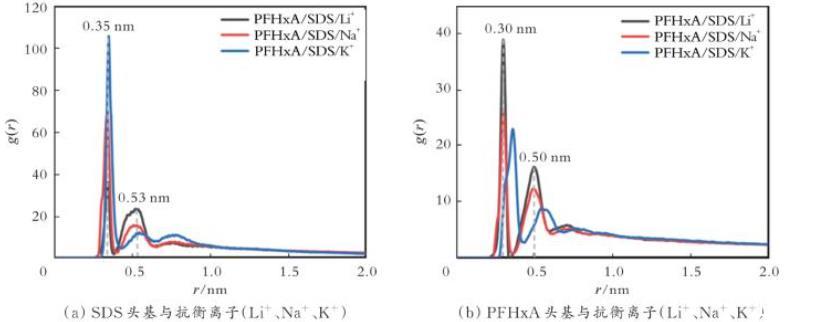 X.L.QUAN等利用全原子模型(CHARMM力場)結合多尺度分析(密度分布、RDF、SASA),定量揭示了陰/陽離子表面活性劑在氣?液界面的協同機制。結果表明,靜電互補(-SO/-NH+)驅動n(PFB?MC)/n(1?OA)=1∶1的復配體系,可形成致密單分子膜,顯著降低表面張力至28.0 mN/m(降幅>30%);n(PFB?MC)/n(1?OA)=1∶1的復配體系中抗衡離子實現了均勻分散,且1?OA具有強氫鍵能力;通過動態可視化技術可揭示非等物質的量比下抗衡離子的競爭吸附行為,且可闡明比例調控機制。該研究可為環保短氟碳滅火劑設計提供原子尺度依據,指導復配比例優化。