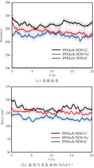 圖7   不同復配體系中表面活性劑分子的關鍵動態性質隨時間的演變曲線