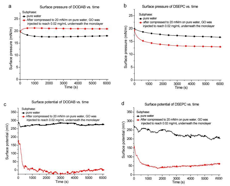 圖 2. (a) DODAB 和 (b) DSEPC 單層的表面壓力與經(jīng)過時間的關系。 單層的表面電位與經(jīng)過時間的關系 (c) DODAB 和 (d) DSEPC。 黑色曲線:單層在純水亞相上被壓縮到 20 mN/m 的表面壓力。 紅色曲線: 將單層壓縮至 20 mN/m 后,將 600 μL 1 mg/mL GO 分散體小心緩慢注入單層下方 進入水亞相以達到 0.02 mg/mL 的 GO。