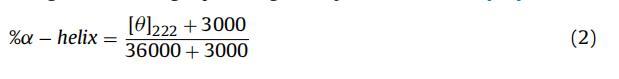 其中 θλ 是在波長(zhǎng)處觀察到的橢圓度(以毫度為單位) λ,M0 是蛋白質(zhì)的平均殘基重量,c 是蛋白質(zhì) 以克/立方厘米為單位的濃度,l 是細(xì)胞的光程長(zhǎng)度,以厘米為單位。 222 nm 處的橢圓度值 (θ222nm/mdeg)用于計(jì)算BSA的α-螺旋含量 使用 Morrisett 等人給出的以下等式。 [44]
