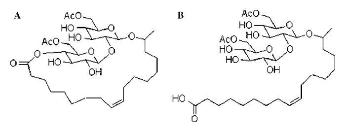 圖1(a)10400內酯和(b)游離酸形式的17-L-[20-O-b-吡喃葡萄糖基-b-D-吡喃葡萄糖基)-氧]-9-十八烯酸60600二乙酸酯槐脂的結構