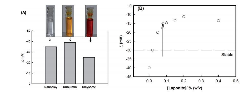使用電泳法測量核殼姜黃素納米顆粒表面的靜電電位(zeta電位)(圖3(A))。值得注意的是,姜黃素和納米粘土均受臨界平衡斥力的控制,而不考慮姜黃素和納米粘土在界面處具有相同極性(負(fù))的zeta電位。關(guān)于復(fù)雜系統(tǒng)中負(fù)責(zé)穩(wěn)定性的不同力的更多細(xì)節(jié)將在后面的章節(jié)中進行理論討論。此外,還測量了分散體的zeta電位,作為室溫下納米粘土濃度的函數(shù)。該電位隨著系統(tǒng)中納米粘土濃度的增加而增加(圖3(B))。最初,當(dāng)納米粘土濃度較低時,電暈較薄,這有利于形成穩(wěn)定的粘粒組裝體,這進一步得到較高zeta電位值的支持。隨著納米粘土濃度的增加,電暈尺寸增加(>100nm),zeta電位也發(fā)生了同樣的情況,這反過來又在復(fù)雜系統(tǒng)中產(chǎn)生了不穩(wěn)定性。
