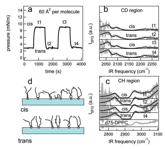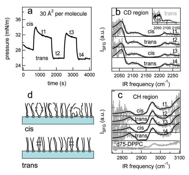 圖6。在脂質/H2O界面處,DT Azo-5P/d75 DPPC的1:5混合物的結果,每個分子的面積為60?2。(a) 表面壓力與時間的關系。用370和450 nm光照射~100秒分別產生順式(高壓)和反式(低壓)狀態。壓力的微小劇烈波動是由于樣品高度的變化,以校正水的蒸發。(b) 相應的VSFG光譜(灰色)以及CD區域的擬合。為了清晰起見,光譜已被抵消。(c) VSFG光譜(灰色)以及用于引導眼睛進入CH區域的擬合。底部曲線顯示了在P時純d75 DPPC的光譜~ 40百萬/米。(d) 脂質尾部方向的示意圖。光開關脂質的偶氮苯部分用灰色圓圈表示。