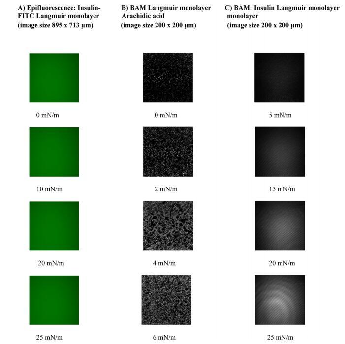 3.4. 人胰島素朗繆爾單層的表觀熒光和布魯斯特角顯微鏡觀察。 人胰島素Langmuir單層的形貌通過FITC人胰島素的表觀熒光進(jìn)行檢查,而布魯斯特角顯微鏡用于2-D純?nèi)艘葝u素。由于胰島素是非熒光的,因此必須附加熒光團(tuán)才能使用表觀熒光顯微鏡。 蛋白質(zhì)常用的探針是異硫氰酸熒光素(FITC)。