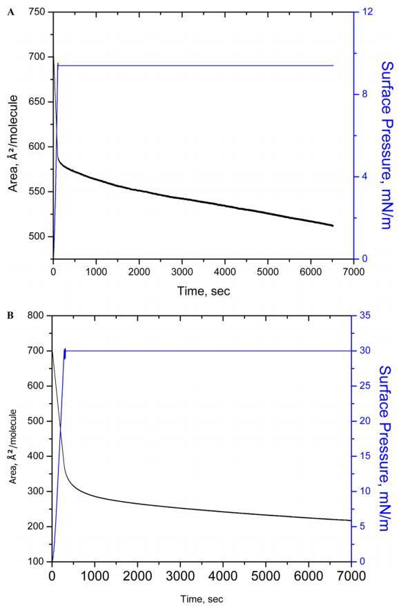 圖3.在亞相pH值5.6下,在表面壓力為10(A)和30 mN/m(B)的條件下,對人胰島素Langmuir單層膜進(jìn)行90 min的穩(wěn)定性測量。