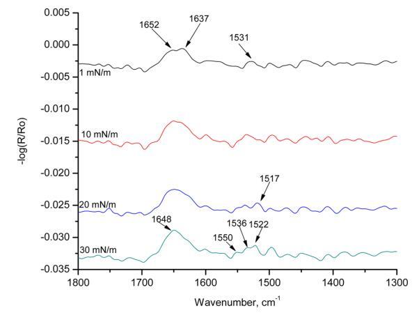 圖7顯示了HI-Langmuir單層在不同表面壓力下60°時(shí)的p極化。 這條帶子在1517厘米處 ? 1對應(yīng)于α-螺旋。 在1 mN/m的表面壓力下,有兩個可見帶:1652和1637 cm ? 1. 隨著表面壓力的增加,這兩個譜帶重疊并成為一個寬帶。 在30百萬米 ? 1,波段可視為單個波段,頻率為1648厘米 ? 1. 這是對應(yīng)于α-螺旋的酰胺II區(qū)域的條帶。 下一個波段在1531厘米處以1 mN/m的寬帶出現(xiàn) ? 1. 隨著表面壓力的增加,它分成三個帶:1550、1536和1522厘米 ? 1. 在1550和1522厘米處的頻帶 ? 1分別對應(yīng)于α-螺旋和β-折疊中的酰胺II區(qū)域。 這種譜帶分裂表明,譜帶位于1531厘米處 ? 在較低的表面壓力下,1由α-螺旋和β-片組成。 在較高的表面壓力下,譜帶分離為離散的單個峰。 光譜中出現(xiàn)的其他峰是由于氨基酸和烷烴鏈的存在。 這條帶子長1448厘米 ? 1對應(yīng)于C ? H CH2和CH3的剪切。 HI-Langmuir單分子膜的p-極化輻照度中存在所有三個表明α-螺旋的主譜帶。