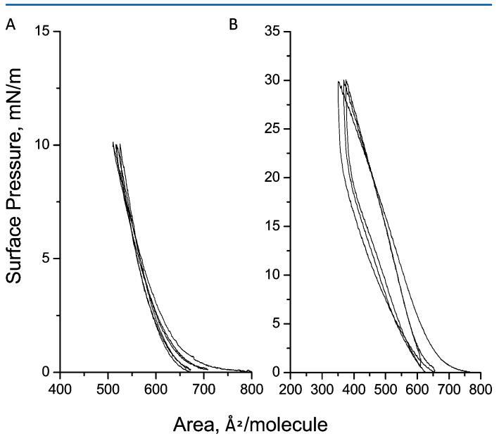 圖2.三個壓縮 ? 在亞相pH值5.6下,減壓循環(huán)達(dá)到10(a)和30 mN/m(B)的人胰島素Langmuir單層表面壓力。