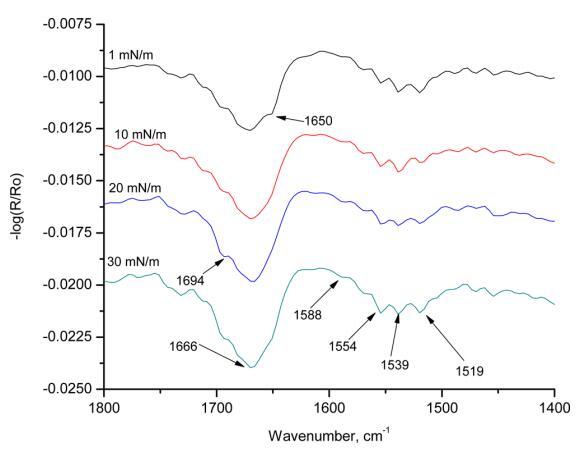 圖9顯示了在不同表面壓力下獲得的HI-Langmuir單層膜的s偏振輻照度。 在1 mN m的表面壓力下 ? 1,在1650 cm處存在一條帶 ? 1對應(yīng)于α-螺旋。 隨著表面壓力的增加,該條帶消失,并在1666 cm處并入該條帶 ? 1. 這條帶子長1666厘米 ? 1包括β-轉(zhuǎn)角和α-螺旋。 這條帶子有1694厘米長 ? 1對應(yīng)于β片。 這條帶子在1519厘米處 ? 1也對應(yīng)于α-螺旋。 在入射角為60°的情況下,在1670處觀察到的能帶可歸屬于存在于β-轉(zhuǎn)角中的空間約束C=O部分,或者由于β-薄片中的躍遷偶極耦合而注意到峰值中的分裂。 當(dāng)改變表面壓力時(shí),最強(qiáng)烈的譜帶出現(xiàn)在1554和1539厘米處 ? 1,兩條帶均對應(yīng)于酰胺II區(qū)的α-螺旋。 所有三條主譜帶都表明HI-Langmuir單層的s極化輻照度中存在α-螺旋。
