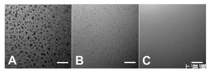 圖3。顯示異質結構域轉變為同質層的熒光圖像。C(HSA-TR)=PBS中的0.01 mg/mL,pH值7.2,離子強度=530 mM。(A)3、(B)8和(C)將蛋白質溶液引入試驗箱后36分鐘。標尺:50μm。