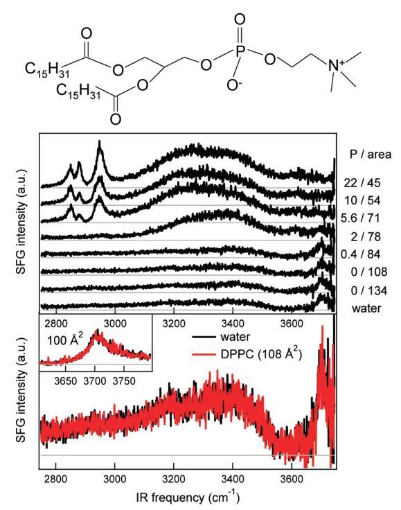 圖1。頂板:DPPC的分子結(jié)構(gòu)。中間面板:裸露水面(底部光譜)和密度增加的水中DPPC的SSP極化SFG光譜。壓力(mN/m)和每個分子的面積(?2)分別從底部到頂部增加和減少,在圖表旁邊給出。每個分子的面積由氯仿溶液滴的數(shù)量控制。CH(2800)?3000厘米?1),氫鍵OH(3000?3600厘米?1),還有免費(fèi)的哦(~3705厘米?1)拉伸振動可見。底部面板:從裸露水面的中間面板放大,每個分子的DPPC為108?2,以表明它們的相似性。插圖放大了裸露水面和DPPC(100?2)表面的自由OH拉伸振動區(qū)域。在每個分子的這個區(qū)域,壓力仍然低于檢測極限,表面上DPPC的存在顯然不影響自由OH拉伸振動的振幅。相對較高的紅外通量(~10 mJ/cm2)用于本實(shí)驗(yàn)。