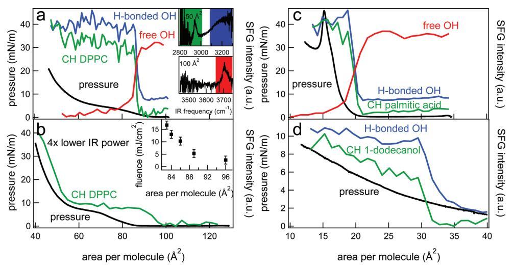 圖2。(a)DPPC的CH信號(綠色)、氫鍵OH信號(藍(lán)色)和自由OH信號(紅色)的表面壓力(黑色,左軸)和積分SFG強(qiáng)度(右軸),作為連續(xù)壓縮單層過程中每個分子面積的函數(shù)。為了清晰起見,集成SFG信號被歸一化,并且彼此之間具有小偏移。集成光譜區(qū)域由插圖中的彩色正方形標(biāo)記,分別顯示CH/OH鍵合和游離OH區(qū)域中每個分子50和100?2的SFG光譜。相對較高的紅外通量(~已使用10 mJ/cm2)。(b)與(a)類似,但紅外功率降低了四倍,導(dǎo)致通量降低了四倍(~2.5 mJ/cm2)。插圖顯示了改變紅外注量對SFG信號出現(xiàn)的每個分子面積的影響。(c)類似于(a),但適用于棕櫚酸。(d)類似于(a),但對于1-十二醇。在這種情況下,未測量1-十二醇的游離OH。SFG結(jié)果是在SSP極化下獲得的。