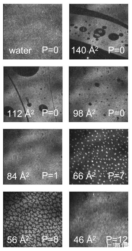 圖3。水上不同密度DPPC的布儒斯特角顯微鏡圖像。圖像大小為600×600μm。白色區(qū)域表示高密度,而黑色區(qū)域表示低密度。在每個面板中,每個分子的面積(單位為?2)在左下角報(bào)告,表面壓力(單位為mN/m)在右下角報(bào)告。這些照片是用自動調(diào)整靈敏度的相機(jī)拍攝的,這樣就無法比較圖像之間的灰度等級。