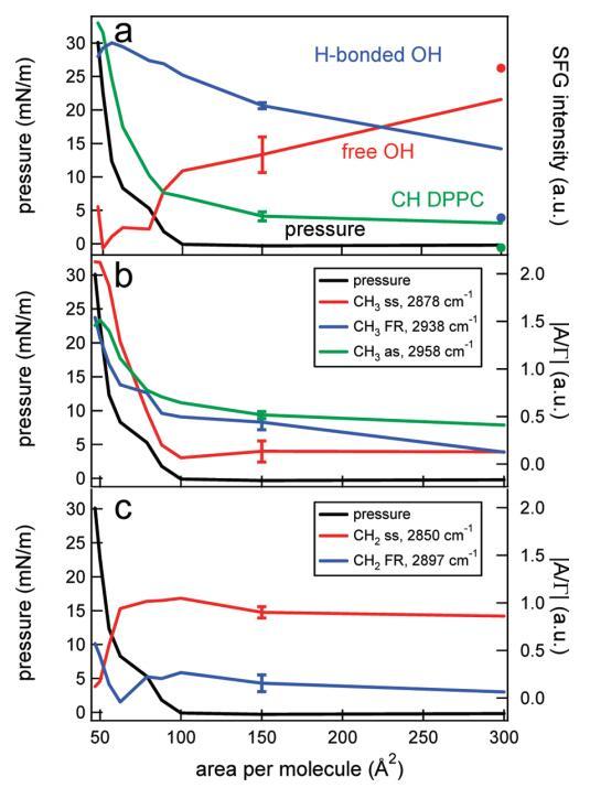 圖6。(a)DPPC的CH信號(綠色)、Hbonded OH信號(藍色)和游離OH信號(紅色)的表面壓力(黑色,左軸)和積分SFG強度(右軸)作為每個分子面積的函數。數據點是通過整合特定光譜區域獲得的,該區域由圖5的光譜中的彩色方塊標記。純水層的CH、OH和游離OH面積(在表面活性劑攤鋪前測量)分別表示為綠色、藍色和紅色圓點。為清晰起見,集成SFG信號已被標準化,并且彼此略微偏移。(b)表面壓力(黑色,左軸)和不同CH3共振(右軸)的絕對振幅/帶寬比(|A/Γ|),通過使用洛倫茲線型模型擬合圖5中的數據獲得。(c)和b一樣,但是對于CH2共振。典型誤差條如圖所示。