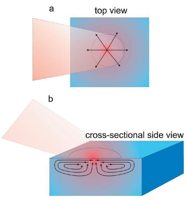 圖4。水樣近表面區域穩態加熱引起的流動示意圖。溫度示意圖上用顏色表示,其中紅色表示熱,藍色表示冷。橙色陰影區域顯示入射到表面的激光束,箭頭表示溫度梯度誘導流動的方向。(a)俯視圖,顯示近表面區域的徑向位移,(b)橫截面側視圖,顯示產生的Marangoni流動單元。請注意,在焦點的中心,水流向上,因此表面可以有效地持續更新。