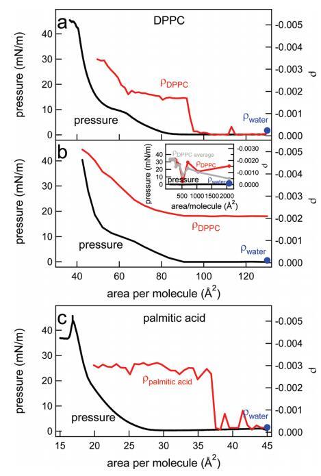 圖8。(a)在制備單分子層后,通過快速添加DPPC溶液持續壓縮單分子層,直到達到130?2的每分子面積,水上DPPC的表面壓力(黑色,左軸)和橢圓系數(紅色,右軸)。(b)水上DPPC的表面壓力(黑色,左軸)和橢圓系數(紅色,右軸)是每個分子面積的函數。通過逐滴添加更多DPPC,每次滴加間隔幾分鐘,改變了該區域。以這種方式達到的每個分子的最小面積為2000?2。插圖顯示了橢圓度系數(對于一個特定實驗(紅色)和三個實驗的平均值(灰色))以及非常低密度下的壓力。(c)在制備單分子層后,通過快速添加棕櫚酸溶液,直到達到每分子45?2的面積,連續壓縮單分子層期間,水上棕櫚酸的表面壓力(黑色,左軸)和橢圓系數(紅色,右軸)。在噴灑表面活性劑之前測量的純水橢圓度在每個面板中以藍色圓點表示。