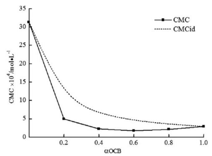 圖6。研究了實(shí)驗(yàn)CMC、理想CMC與OCB摩爾分?jǐn)?shù)的關(guān)系。