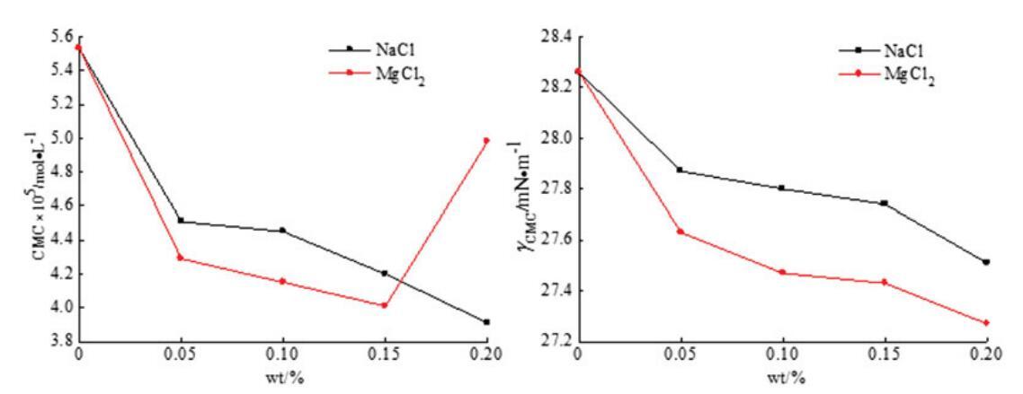 圖9。無(wú)機(jī)鹽(NaCl和MgCl2)對(duì)OCB/SDS體系中表面活性的影響。