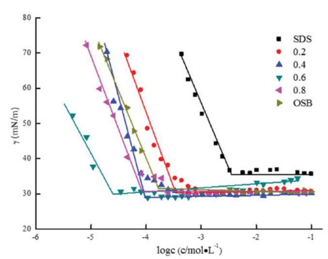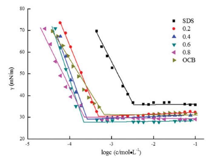 圖5。不同摩爾比下單獨(dú)OCB、SDS和混合OCB/SDS的表面張力與濃度對(duì)數(shù)的關(guān)系。