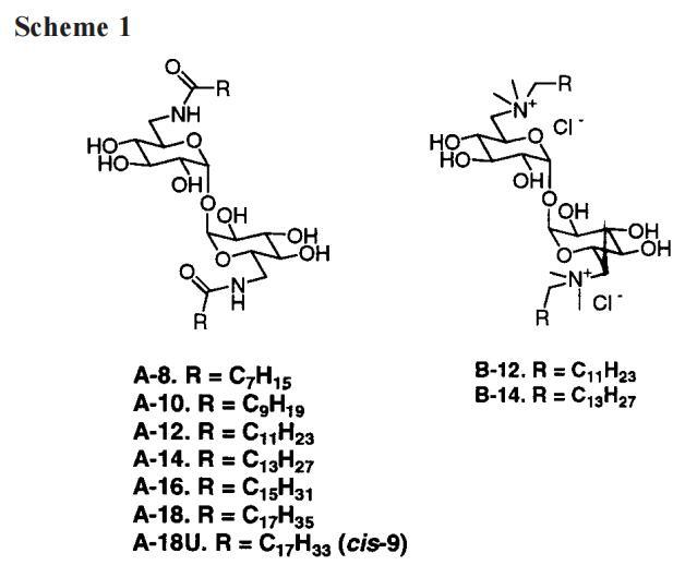 本文研究以海藻糖為間隔基的雙子座(方案1)。A系列由海藻糖組成,其6-和6′-羥基被長鏈酰胺取代。B系列在6-和6′位置有長鏈季銨鹽基團(tuán)。我們選擇海藻糖作為糖間隔物并不是隨意的。首先,海藻糖是一種雙糖,允許兩條烴鏈相隔相當(dāng)長的距離。雙子座中受限的分子內(nèi)鏈/鏈相互作用是一種結(jié)構(gòu)特征,過去僅對(duì)其進(jìn)行了簡要研究。15秒后,海藻糖(一種從細(xì)菌、藻類、昆蟲和植物等多種自然來源中分離出來的糖)可以保護(hù)生物膜免受脫水的壓力。16因此,在生物膜的“細(xì)胞模擬”建模方面,我們對(duì)海藻糖雙子感興趣。17第三,從實(shí)用的角度來看,海藻糖很有吸引力,因?yàn)樗瑑蓚€(gè)完全相同的D-葡聚糖單元。這簡化了化合物的合成和分析,與大多數(shù)其他雙糖相比,化學(xué)性質(zhì)不同的羥基數(shù)量減少了一半。但盡管對(duì)稱,合成純海藻糖雙子座的途徑(方案2和方案3)無疑是隨后物理化學(xué)的一個(gè)乏味的序言。