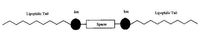 兩個(gè)末端烴尾可以是短的,也可以是長的;兩個(gè)極性頭基可以是陽離子、陰離子或非離子;間隔物可以是短的或長的、柔性的或剛性的、極性的或非極性的(參見參考文獻(xiàn)1中的方案1)。8-12雙子座不需要圍繞間隔物的中心對(duì)稱布置。13,14顯然,豐富的化合物存在于合成可能性的范圍內(nèi)。