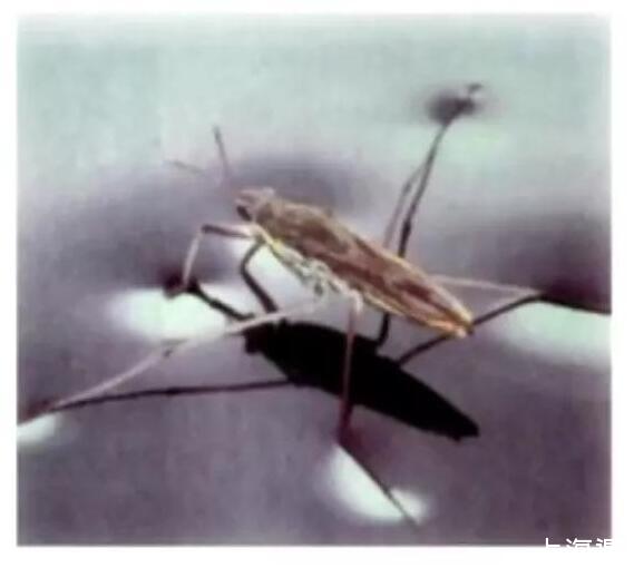 接下來我們看一下,水黽或者繡花針為什么能站在水面上?很顯然不是浮力的作用,如果有福利的話,必須要有排開水的體積。