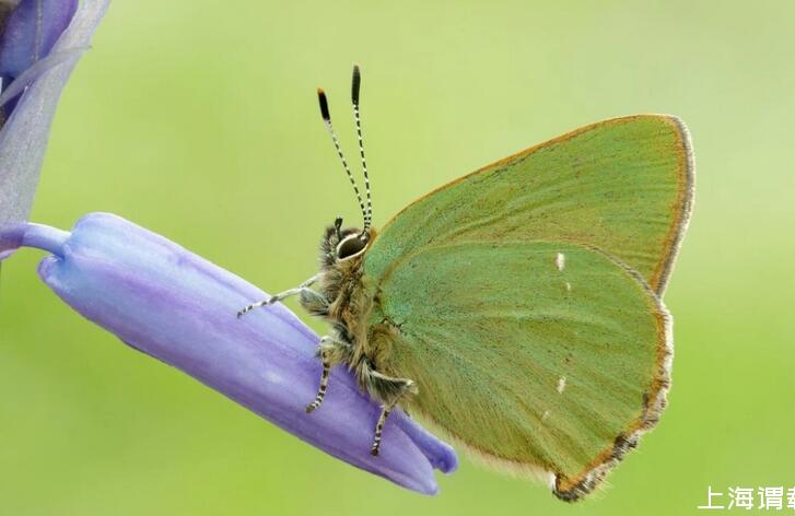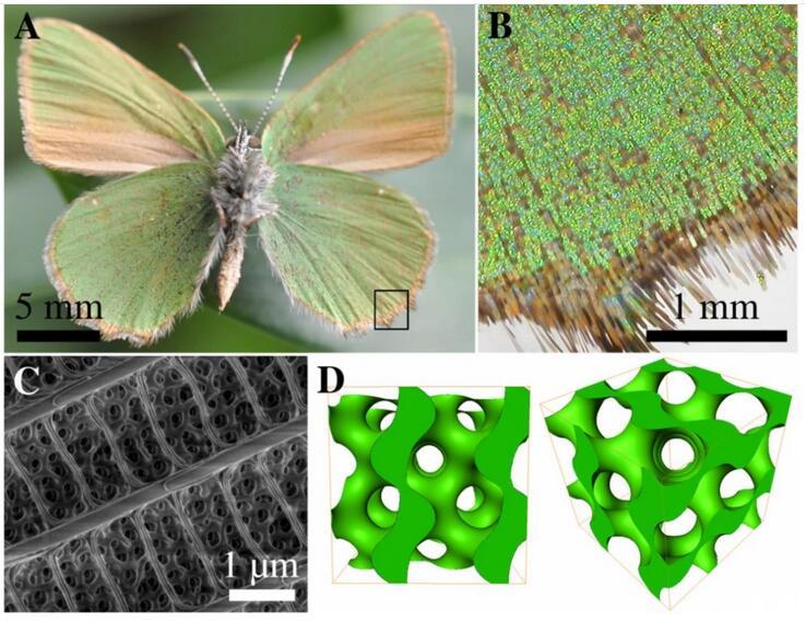 有些種類的蝴蝶,例如歐洲的黃星綠小灰蝶(green hairstreak,Callophrys rubi)和寬絨番鳳蝶(emerald-patched cattleheart,Parides sesostris),其翅膀鱗片上就有一種周期性極小曲面——螺旋二十四面體(gyroid)。從曲面的凸起處和從其他結(jié)構(gòu)處反射回來的光波之間會(huì)發(fā)生干涉,波長的變化也就意味著顏色的消失或出現(xiàn)。這就是翅膀鱗片產(chǎn)生顏色的特別技巧。